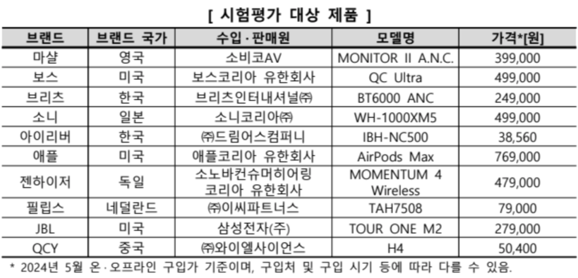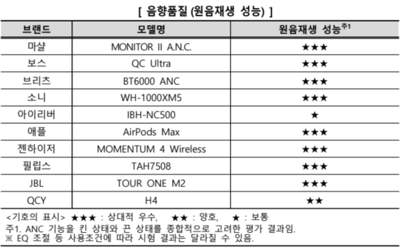 마샬(MONITOR II A.N.C.), 보스(QC Ultra), 브리츠(BT6000 ANC), 소니(WH-1000XM5), 애플(AirPods Max), 젠하이저(MOMENTUM 4 Wireless), 필립스(TAH7508), JBL(TOUR ONE M2) 등 8개 제품은 음의 왜곡이 적어 상대적으로 우수했다.