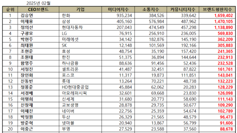 2월 CEO 브랜드평판 30위 순위는 김승연, 이재용, 정의선, 구광모, 박현주, 최태원, 조현준, 조원태, 함영주, 서정진, 장인화, 신동빈, 정몽준, 서경배, 이명희, 신창재, 이해진, 박정원, 방준혁, 이중근, 정지선, 황병우, 허태수, 정몽규, 우오현, 이호진, 양종희, 박찬구, 빈대인, 구자열 순으로 분석됐다.