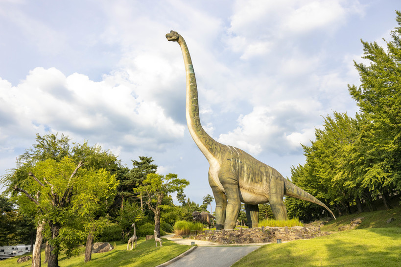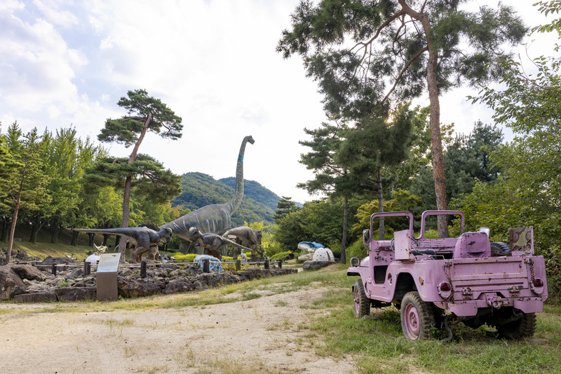 ▲ 브라키오사우루스를 배경으로 설치된 공룡 모형과 군용 지프. 야외 전시장이 하나의 테마파크 같은 분위기를 자아낸다.(사진=칠곡군) |