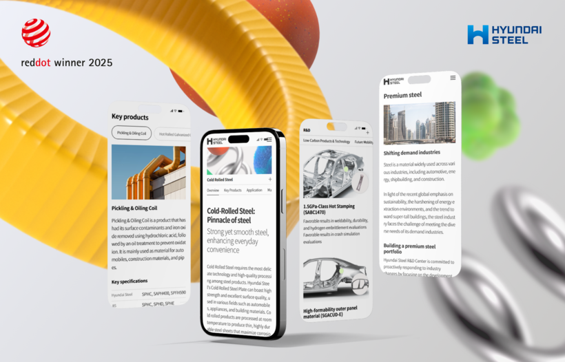 [일요주간 = 엄지영 기자] 현대제철은 무거운 철강, 가벼운 경험이라는 콘셉트로 새롭게 단장한 공식 홈페이지가 2025 레드닷 디자인 어워드(2025 Red Dot Design Award)의 브랜드&커뮤니케이션 디자인 부문에서 본상을 수상하며, 철강 산업의 딱딱한 이미지를 탈피하고 사용자 친화적인 디지털 소통 역량을 인정받았다.