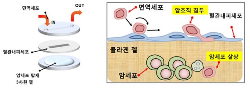 도준상 교수팀은 “이번 연구에서 종양 조직의 혈관-기질 구조와 기능을 모사하는 바이오칩을 개발해 혈관 내 면역세포가 고형암 세포를 죽이기 위해 거쳐야 하는 전체 과정을 모사할 수 있게 했다”며 “이 바이오칩을 이용하면 면역세포 치료제 개발에서 면역세포의 항암 효능의 체계적인 분석이 가능해 면역세포 치료제 개발을 가속할 것”이라고 기대했다.