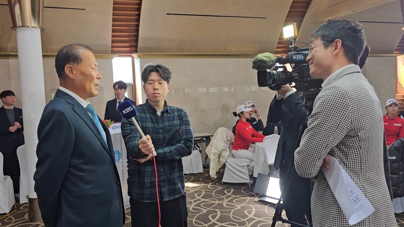 | ▲ 대보그룹 최등규 회장이 ‘2024 대보골프단 출범식’에서 한 방송과 인터뷰 중인 모습.(사진=대보그룹 제공) |