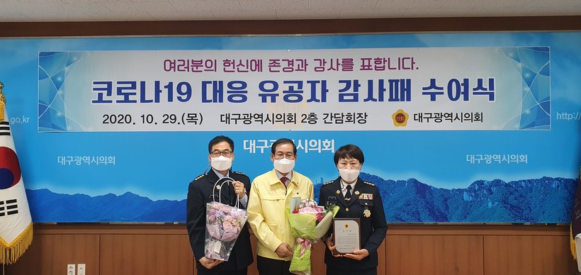 | ▲ 대구광역시의회는 29일 시의회 간담회장에서 코로나19 대응 유공자 감사패 수상식을 가졌다 |