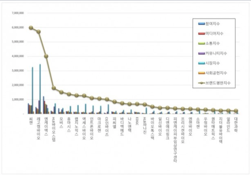 1위, 씨젠 브랜드는 참여지수 73만 5245 미디어지수 62만 6870 소통지수 59만 6555 커뮤니티지수 59만 9119 시장지수 324만 6310 사회공헌지수 17만 3283이 되면서 브랜드평판지수 597만 7382로 분석됐다. 지난 2월 브랜드평판지수 454만 5938과 비교해보면 31.49% 상승했다.​