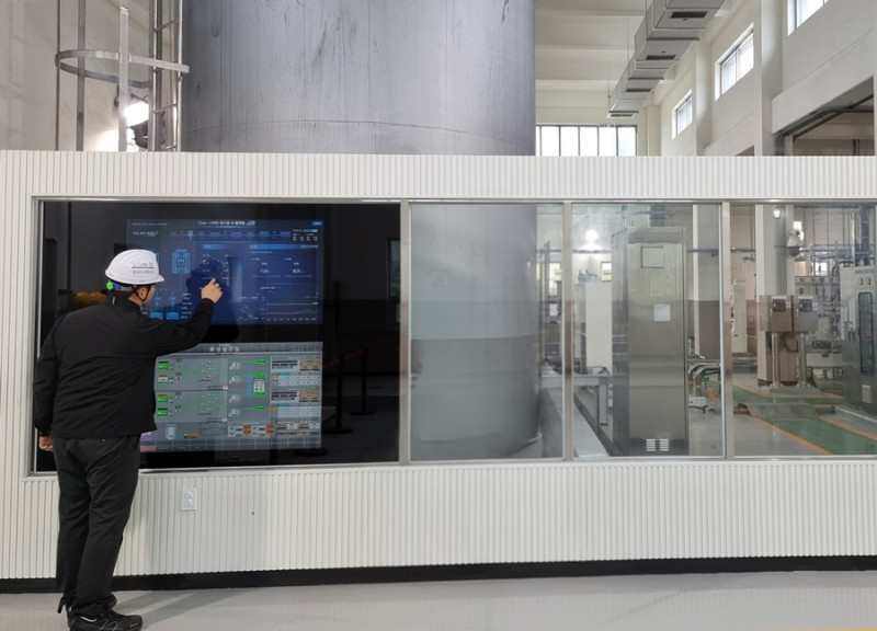 ▲ 한국수자원공사 AI 정수장에서 약품주입동에 구현된 ‘스마트 미러’로 정수처리에 필요한 약품주입 자율공정 현황을 점검하는 직원.(사진=한국수자원공사 제공) |