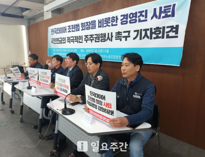 금속노조, 민변 민생경제위원회, 민주노총, 참여연대 등 노동시사회단체는 21일 한국타이어 조현범 회장을 비롯한 경영진 사퇴와 국민연금의 적극적인 주주권행사를 촉구하는 기자회견을 열고 이 같이 밝혔다.