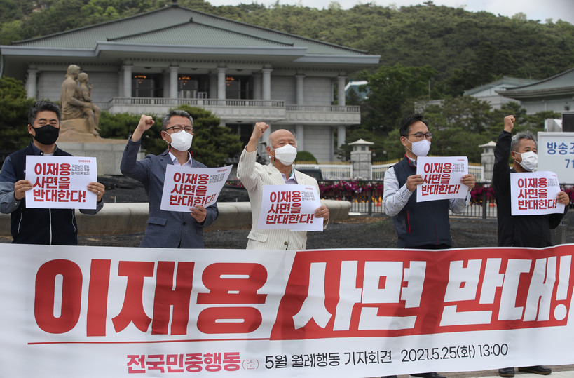 | ▲전국민중행동 등 시민 사회단체 회원들이 지난 5월 25일 오후 서울 종로구 청와대 분수대 앞에서 이재용 삼성전자 부회장 사면 반대 기자회견을 하고 있다.(사진=newsis) |