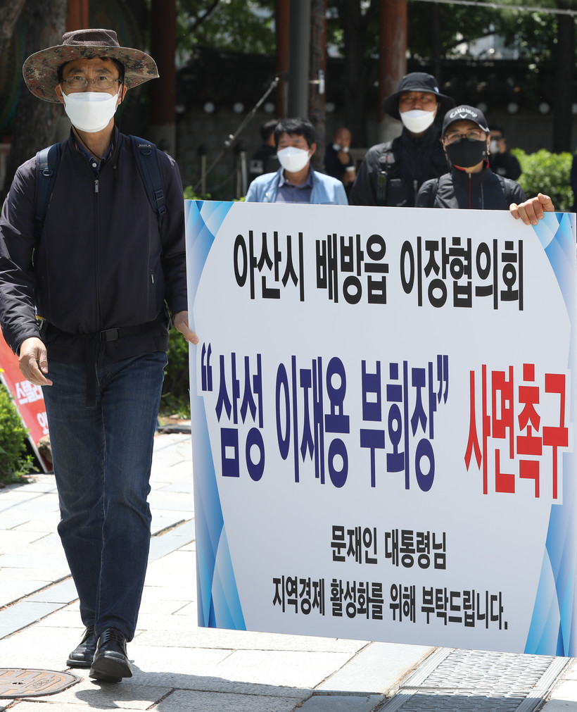 | ▲아산시 배방읍 이장협의회가 지난 5월 25일 오후 서울 종로구 청와대 분수대 앞에서 이재용 삼성전자 부회장의 사면을 촉구하는 피켓을 들고 행진하고 있다.(사진=newsis) |