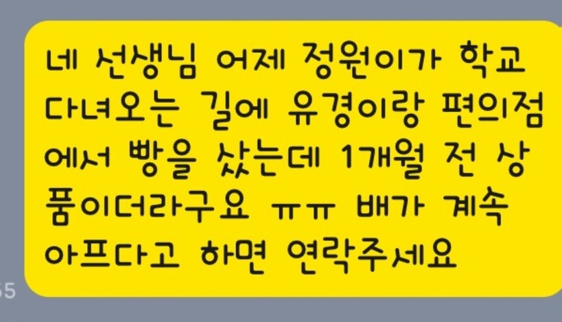 ▲A 씨의 초등학교 딸 아이가 유통기한이 지난 빵을 먹고 설사와 복통으로 아파서 학교를 못나가게 된 상황을 학교 선생님에게 설명하는 카카오톡 내용.(제보자 제공) |