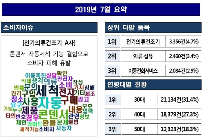 주요 내용으로는 전기의류건조기 관련해서는 자동세척 기능에 대한 상담 건수가 제일 많았고 승강설비는 승강기 고장에 대한 보상문의, 공연관람은 취소와 환불 기준에 대한 문의가 가장 많았던 것으로 나타난다.