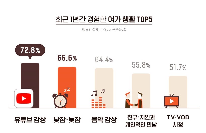 이어 ‘낮잠·늦잠’(66.6%), ‘음악 감상’(64.4%), ‘TV·VOD 시청’(51.7%) 등 미디어 감상 경험이 두드러졌다.