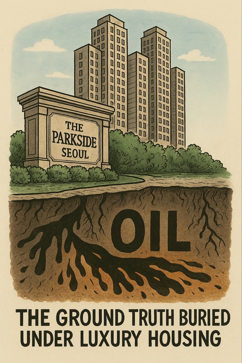 서울 용산구 이태원동, 고급 주거 단지 ‘더 파크사이드 서울’이 들어설 유엔사부지. 하지만 그 화려한 외관 뒤에는 20여 년간 반복된 기름 유출과 부실한 정화 작업이라는 감춰진 진실이 존재한다.