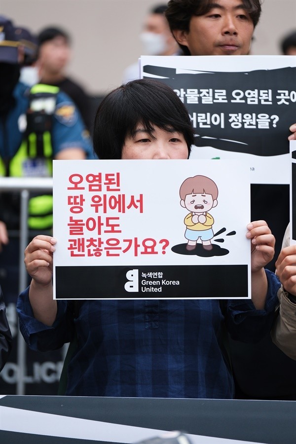 ▲ 녹색연합 활동가들이 용산어린이정원 개방에 앞서 오염된 땅에서 놀아도 괜찮은 것인지를 묻는 항의기자회견을 진행하고 있다. ⓒ 녹색연합 |