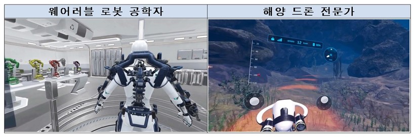 고용정보원은 “VR 콘텐츠에서는 재난구조대원을 위한 착용형 근력 강화 로봇을 만들어볼 수 있다”며 “음성과 자막으로 제공되는 안내에 따라 신체정보 반영, 부품 결합, 화재 현장 시뮬레이션 등을 차례로 수행하면 된다”고 설명했다.