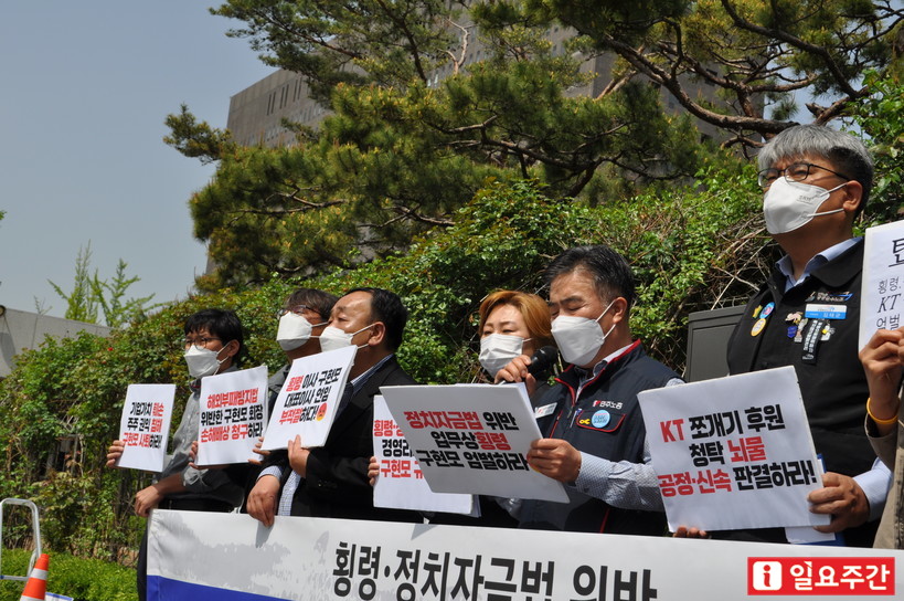 | ▲28일 서울 오전 서울 서초구 중앙지방법원 앞에서 한성규 민주노총 부위원장등은 기자회견을 열고 구현모 KT대표의 횡령 및 정치자금법 위반 혐의에 대해 엄중 처벌, 신속 판결을 촉구했다. <사진=성지온 기자> |