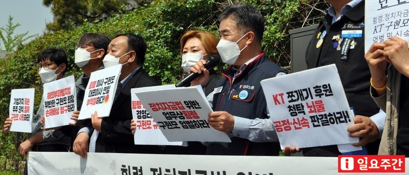 이어 “KT가 국내 최초로 미국 해외부패방지법을 위반한 기업이란 불명예와 함께 과징금을 부과받은 사실은 그야말로 창피한 일”이라며 “그런데도 구현모는 여전히 대표이사직을 유지하고 반성은커녕 정치자금을 후원한 일이 회사를 위한 일이었다는 적반하장격 거짓말로 기업 가치를 떨어뜨리고 있다. 이로 인해 KT 내 구성원들의 자존심까지 짓밟히고 있다”라고 분개했다.
