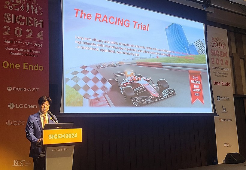 ▲ 대한내분비학회 주관 SICEM 2024 런천 심포지엄에서 한양대 의대 유성훈 교수가 발표를 진행하고 있다. 한미약품의 이상지질혈증 치료 복합신약 ‘로수젯’의 임상적 이점이 국내 학회에서 관계자들의 이목을 모았다. (사진=한미약품 제공) |