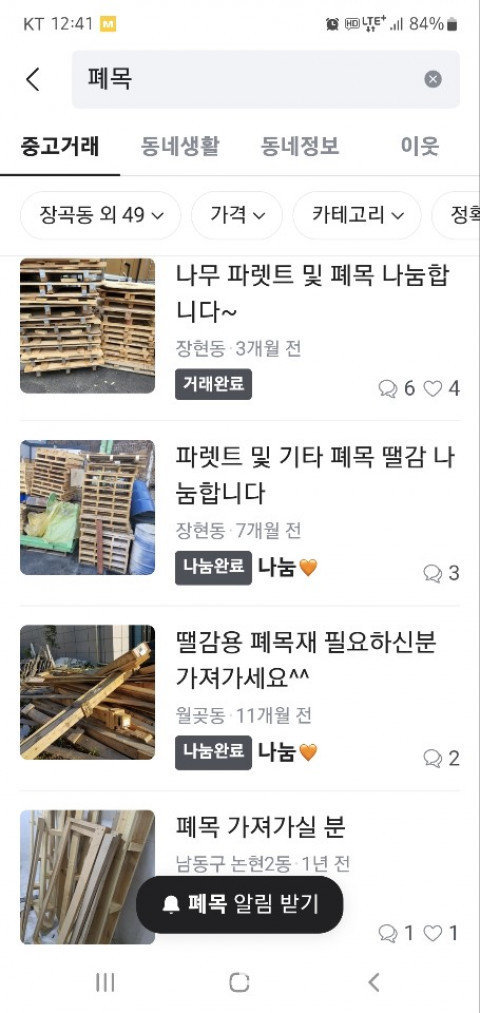 협회가 9월 국내 주요 중고 거래 플랫폼을 조사한 바에 따르면, 수도권 일부 지역에서만 하루 수십건의 폐목재 무료 나눔 및 판매 의뢰가 올라와 있다.