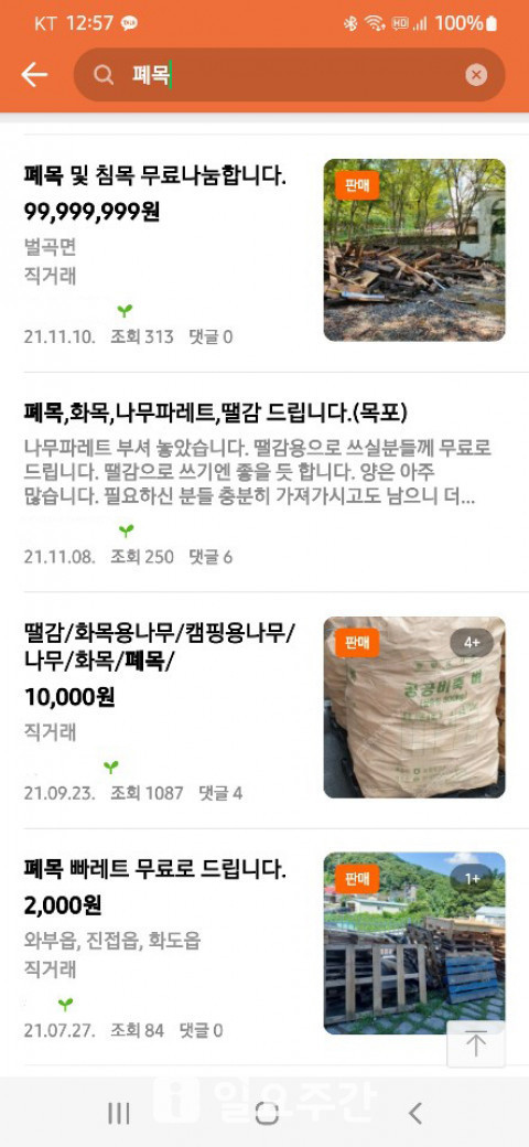 ▲중고 거래 플랫폼에 올라온 건설, 철도 침목, 가구, 철거목 거래 글. |