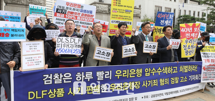 ▲ 우리은행의 해외 금리연계 파생결합펀드(DLF)로 투자금을 잃은 피해자들과 금융정의연대 등 시민단체가 지난 10일 오후 서울 양천구 서울남부지검 앞에서 손대승 우리은행장에 대한 사기죄 고소장 제출을 앞두고 기자회견을 하고 있는 모습. |