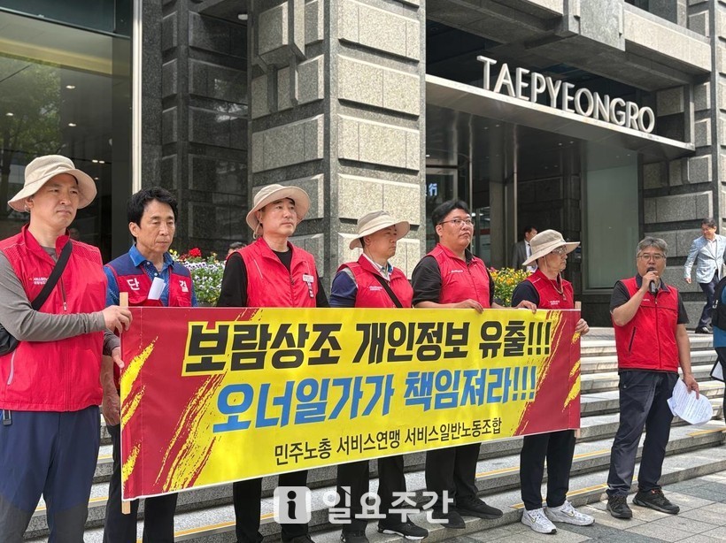 | ▲ 민주노총 서비스일반노조 보람상조지회는 지난 7일 오전 서울 중구에 위치한 보람상조 본사 앞에서 기자회견을 열고 보람상조 개인정보 유출 사태와 관련해 오너 일가의 방만경영과 무책임을 규탄했다. (사진=서비스일반노조 보람상조지회 제공) |