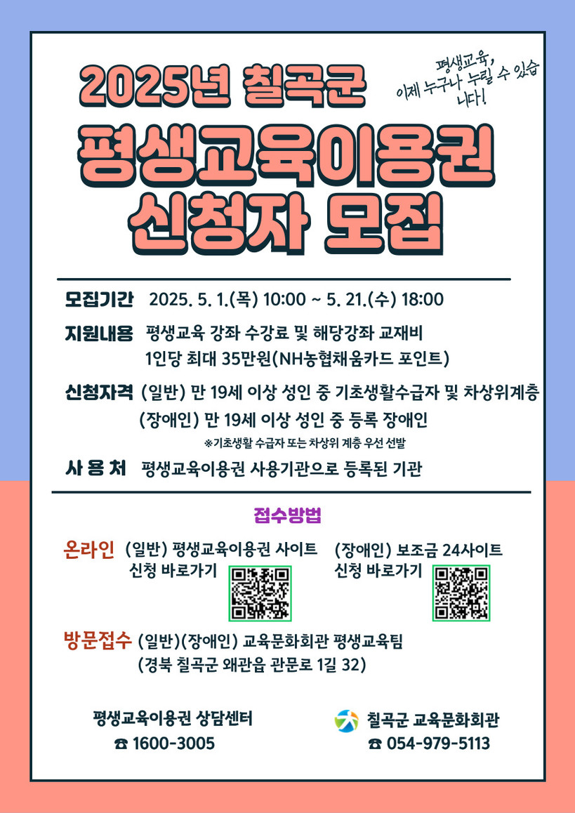 신청 기간은 5월 1일부터 5월 21일까지이며, 저소득층 대상자는 경상북도 평생교육 이용권 누리집에서, 장애인 대상자는 보조금24 누리집에서 신청 가능하다. 방문접수도 가능하며 보다 자세한 사항은 교육문화회관 평생교육팀(054-979-5113) 또는 평생교육이용권 상담센터(1600-3005)로 문의하면 된다.