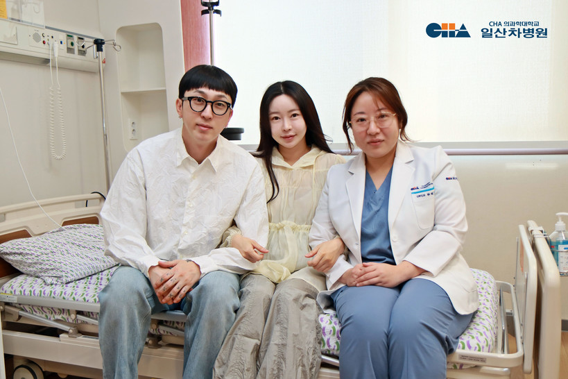 ▲ 일산차병원에서 둘째 아이를 득남하고 아이코드에 제대혈을 보관한 방송인 슬리피씨 부부가 주치의 부혜연 교수와 기념 촬영을 하고 있다. (사진=차병원 제공) |
