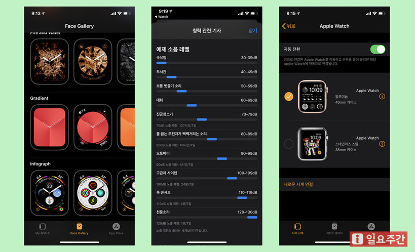 또 소음 데시벨을 상시 측정해, 청력에 위험한 수준이 감지되면 이를 알려주는 것도 좋은 기능 중 하나다. 여기에 건강 관련 워치앱이 다양하게 있어, 칼로리 관리, 물 자주 먹기 등의 결심 프로젝트의 동기 부여까지 개인 코치 한명을 둔 것처럼 든든하다.