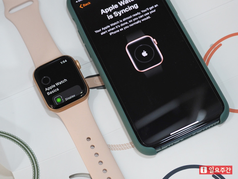 | ▲애플워치 시리즈5, 아이폰11 프로와 연동 (사진=지혜수 기자) |