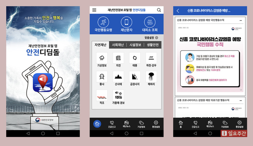 ▲비상 상황시 문자와 속보 등의 각종 정보를 제공하는 정부앱 '안전디딤돌' (이미지=지혜수 기자) |