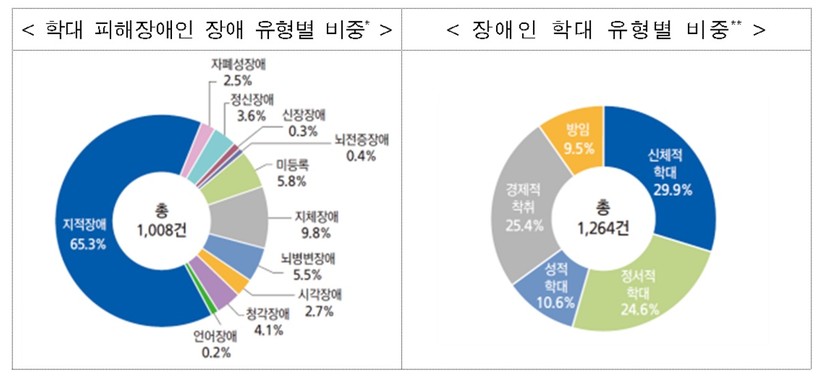 장애인 학대 유형은 신체적 학대가 29.9%(378건)로 가장 높은 비중을 차지했다. 이어 경제적 착취 25.4%(321건), 정서적 학대 24.6%(311건) 순이었다.