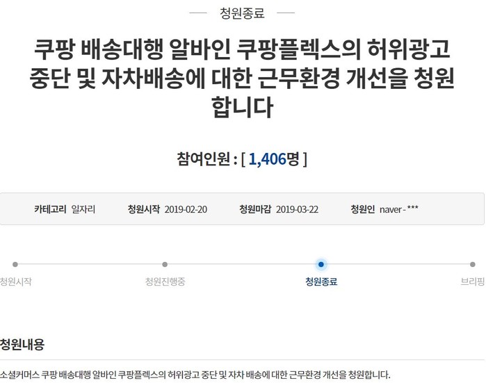 그런데 이들 쿠팡플렉서들의 열악한 근무환경을 개선해 달라는 국민청원이 등장했다. 지난달 20일 청와대 국민청원게시판에는 ‘쿠팡 배송대행 알바인 쿠팡플렉스의 허위광고중단 및 자차배송에 대한 근무환경 개선을 청원합니다’라는 제목의 게시글이 올라왔다.