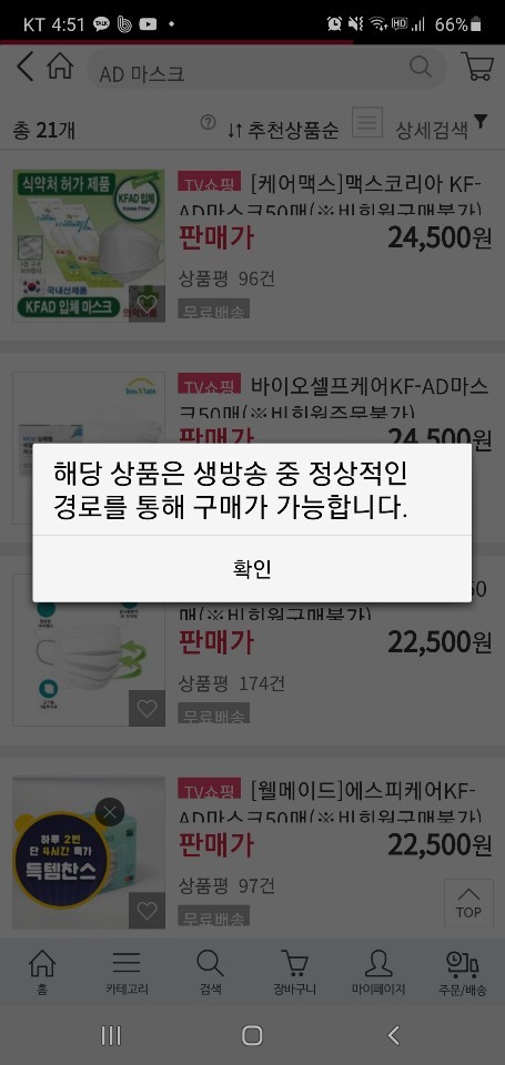 | ▲ 공영홈쇼핑은 비말 마스크(2D) 일부 상품에 대해 마스크 정책 강화라는 이유로 일부 비말 마스크 관련 업체들의 마스크 판매 방송을 중단했으며 온라인상에서 판매가 되지 않고 있다.(출처 : 공영홈쇼핑 캡처) |