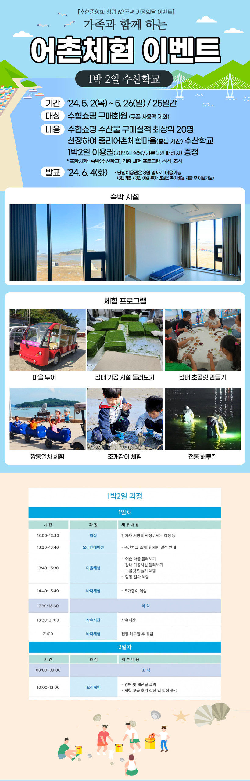 [일요주간 = 김완재 기자] 창립 62주년을 맞은 수협중앙회는 직영 쇼핑몰 수협쇼핑이 5월 가정의 달을 맞이해 어촌마을과 손잡고 ‘가족과 함께 하는 어촌체험 이벤트’를 개최한다고 7일 밝혔다.