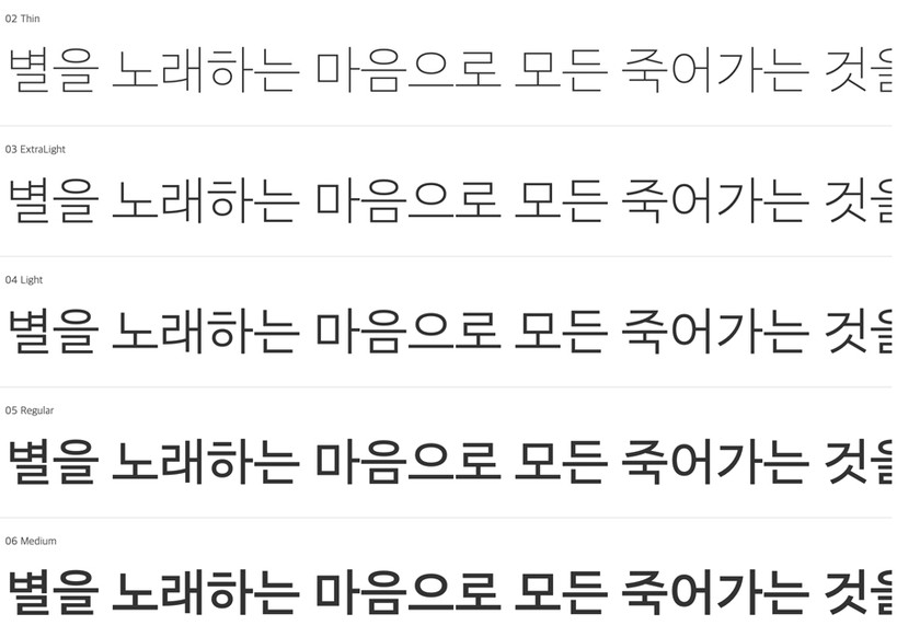 또한 ‘헤어라인’부터 ‘블랙’까지 10종의 웨이트로 이뤄져 있어 아주 작은 본문부터 매우 두꺼운 제목까지 폭넓은 구성으로, 다양한 부분에서 활용 가능하다. 특히 Black은 시중에 나와 있는 한글 폰트 가운데 획의 굵기가 가장 두껍기 때문에 제작물에 사용시 강렬한 이미지를 줄 수 있는 것도 특징이다.