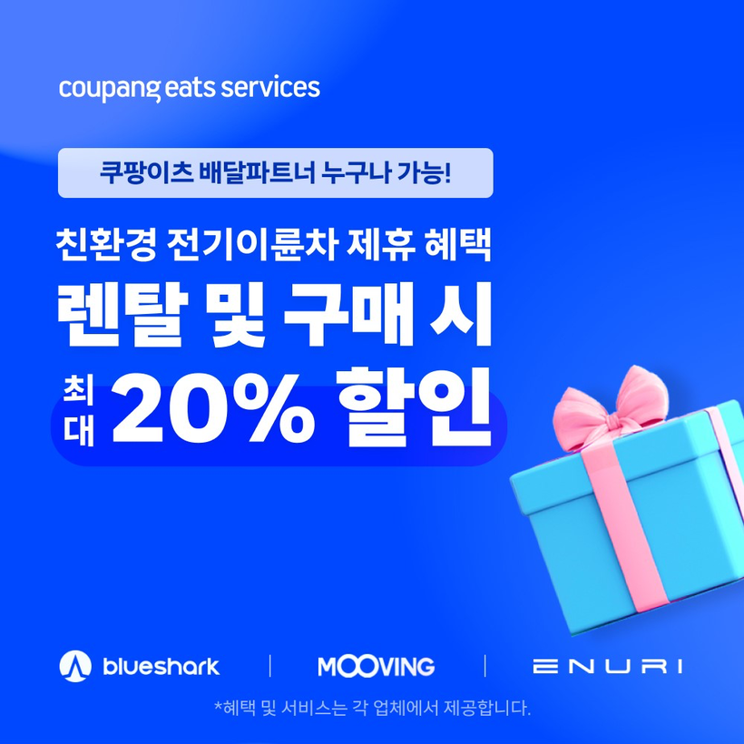 쿠팡이츠서비스는 전기이륜차 전문 회사 블루샤크코리아, 무빙, 이누리와 제휴해 배달파트너들이 전기이륜차 구매 또는 렌탈시 제휴업체로부터 할인 혜택을 받을 수 있도록 했다. 다양한 기업 제휴로 여러가지 기종의 구매, 렌탈 상품을 구비해 배달파트너 선택의 폭을 넓혔다. 등록된 모든 배달파트너는 별도의 조건 없이 제휴 혜택을 받을 수 있어 친환경 전기이륜차에 대한 접근성을 높이고자 했다.