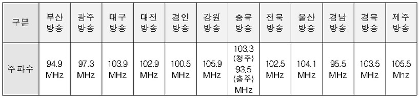| ▲ 도로교통공단 TBN교통방송 지역별 주파수 (표=도로교통공단) |