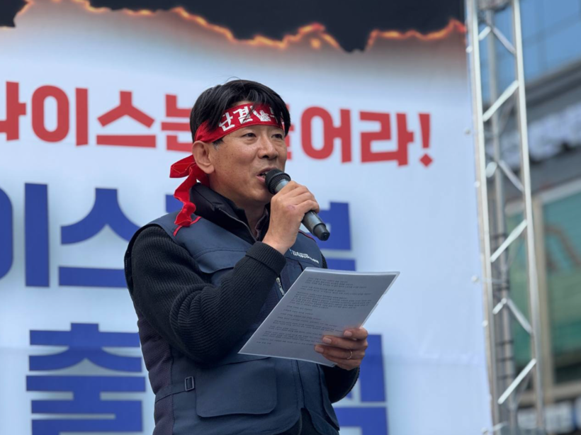 ▲ 민주노총 서비스연맹 전국가전통신서비스노동조합 이현철 위원장이 31일 서울 청호나이스 본사 앞 집회에서 발언하고 있다. (사진=전국가전통신서비스노동조합 제공)