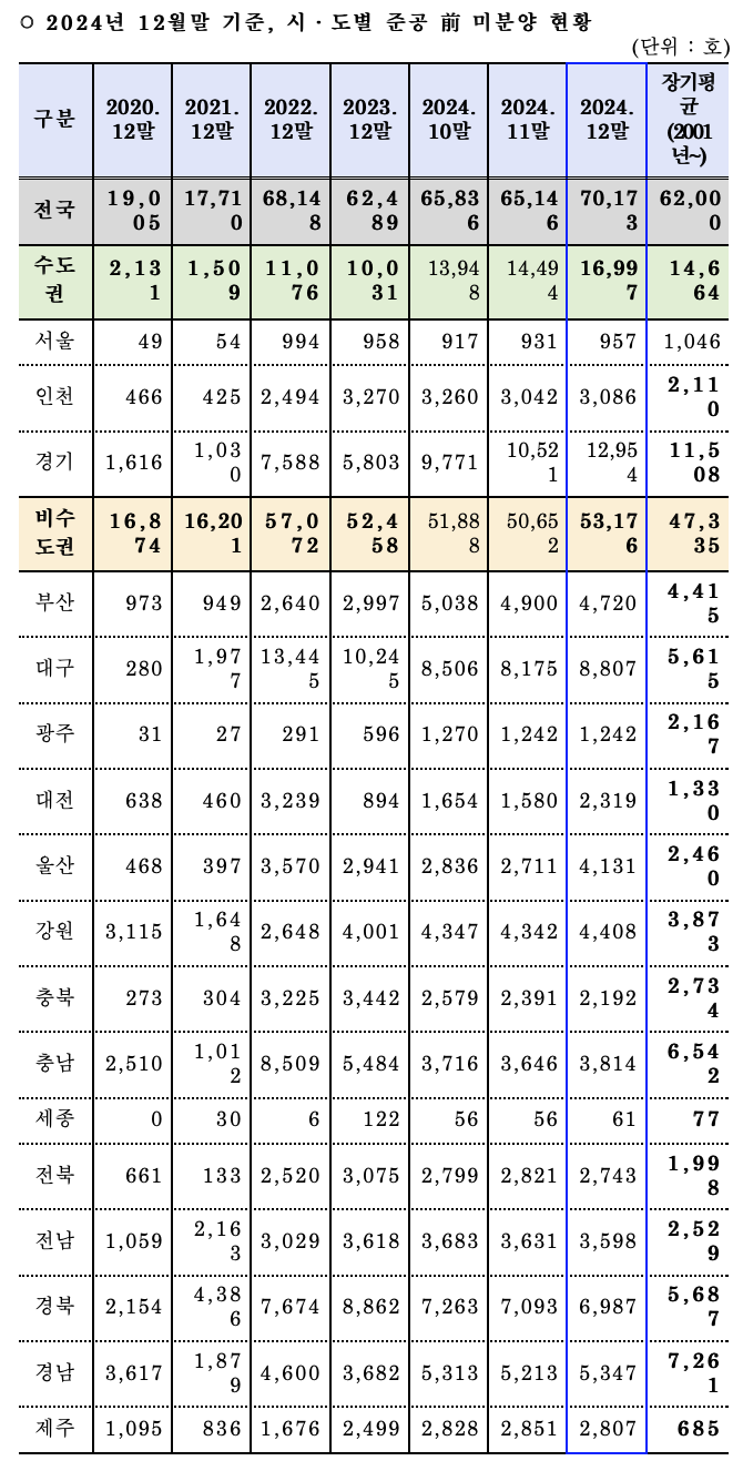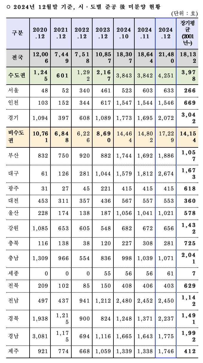 강민국 의원실에서 국토교통부에 자료요청을 통해 받은 답변자료인 '시.도별 미분양 주택 현황'을 살펴보면 현재(2024년 12월말) 전국에 악성 미분양으로 불리는 준공 후 미분양 주택수는 무려 2만 1480호나 되는 것으로 확인됐다.