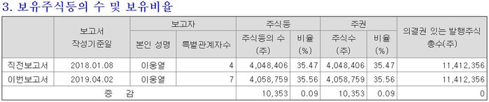 ▲코오롱생명과학은 특별관계자인 이웅열등의 지분율이 35.47%에서 35.56%로 변동했다고 2일 공시했다.(출처=전자공시시스템) |