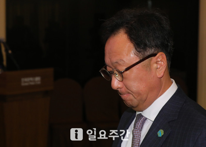 ▲코오롱생명과학 골관절염 치료제 판매중단 관련 1일 기자간담회에 참석한 이우석 대표이사가 입을 굳게 다문 채 단상에 오르고 있는 모습 |
