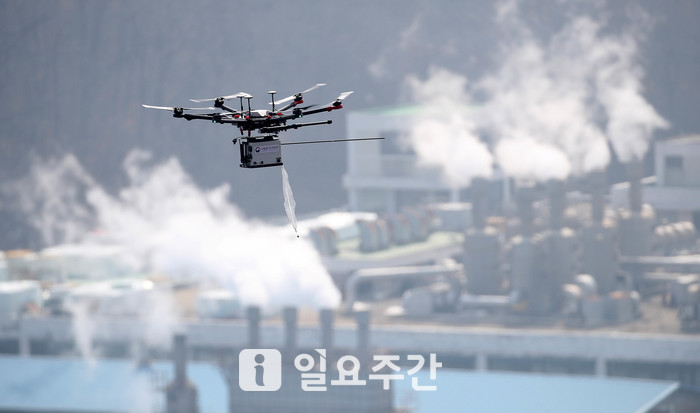 | ▲ 환경부 국립환경과학원과 수도권대기환경청 미세먼지 감시팀이 오염물질 측정이 가능한 드론을 이용해 미세먼지 배출사업장 단속을 진행하고 있는 모습. |
