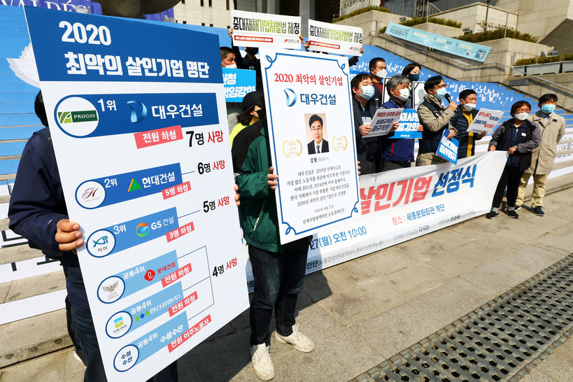 당시 산재사망 대책마련 공동 캠페인단 측은 “대우건설은 100대 건설사 중 유일하게 지난 10년 간 연평균 5건 이상의 사망 사고가 발생한 곳”이라며 “2016년 8명, 2017년 3명, 2018년 3명, 2019년 6명, 2020년 4명의 노동자가 사망했다”라고 말했다.