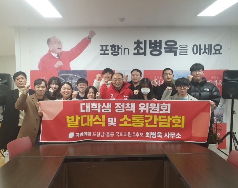 [일요주간 = 최종문 기자] 최병욱 국민의힘 포항 남구·울릉군 국회의원 예비후보가 지난 7일 청년 정책위원회와 함께 간담회를 갖고 지역 현안과 청년 정책을 모색하는 시간을 가졌다고 8일 밝혔다. 이날 간담회에는 위덕대학교 특수교육학부 재학생 등 지역 대학생들이 참석했다.