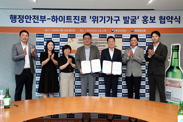 하이트진로는 지난 24일 서초동 본사에서 행정안전부와 ‘위기가구 발굴 홍보 협약식’을 개최한 가운데 하이트진로 장인섭 전무와 스마트복지안전공동체추진단 구본근 단장이 참석했다. 이번 협약으로 참이슬 150만 병 뒷면 보조 라벨에 ‘힘들 땐 129(보건복지상담센터) 또는 가까운 읍.면.동 사무소(행정복지센터)에 꼭! 전화 또는 방문하세요’ 문구가 기재된다. 7월부터 수도권을 중심으로 식당 등에서 만나볼 수 있다.