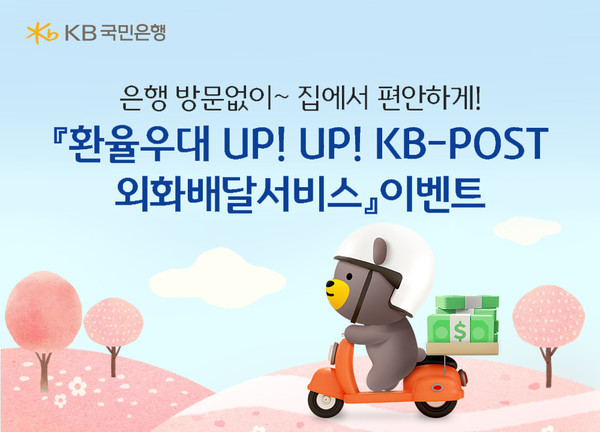 [일요주간 = 노현주 기자] KB국민은행은 ‘KB-POST외화배달서비스’ 환율 우대율 리뉴얼을 기념해 오는 5월 말까지 경품 추첨 이벤트를 실시한다고 27일 밝혔다.