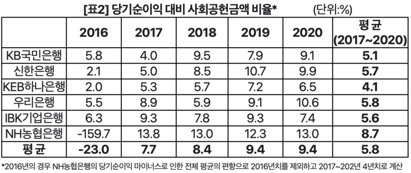 당기순이익 대비 사회공헌 금액 각 은행비율은 NH농협은행 8.7%, 우리은행 5.8%, 신한은행 5.7%, IBK기업은행 5.6%, KB국민은행 5.1%, KEB하나은행 4.1%순으로 나타났다.