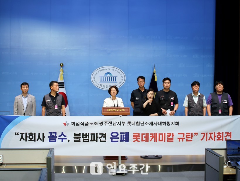 ▲지난 20일 국회소통관에서 열린 롯데케미칼 첨단소재 여수공장 사내하청노동자 직접 고용 촉구 기자회견.(사진=일요주간 DB)