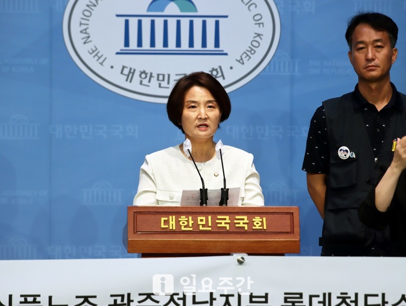 ▲지난 20일 국회소통관에서 열린 롯데케미칼 첨단소재 여수공장 사내하청노동자 직접 고용 촉구 기자회견에서 발언하고 있는 정의당 이은주 의원.(사진=일요주간 DB)