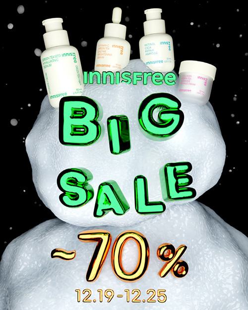 올 해 마지막 득템의 기회로 큰 할인과 다양한 혜택이 더해진 이니스프리 ‘12월 빅세일’의 자세한 내용은 이니스프리 매장 및 공식 홈페이지를 통해 확인할 수 있다.